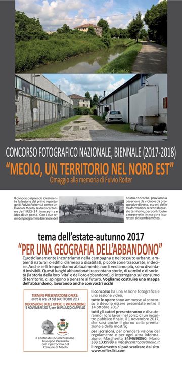 Il Centro di Documentazione Pavanello, con il patrocinio del Comune di Meolo, organizza il concorso fotografico nazionale “Meolo, un territorio del nord est”, biennale (2017-2018), omaggio alla memoria di Fulvio Roiter.