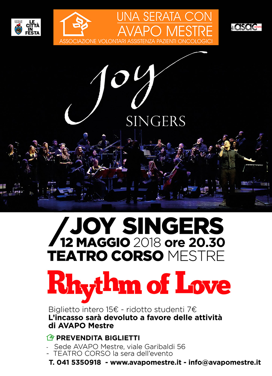 Sabato 12 maggio 2018 alle 20.30 presso il Teatro Corso a Mestre appuntamento con il concerto del gruppo corale The Joy Singers che porterà in scena lo spettacolo musicale Rhythm of Love.